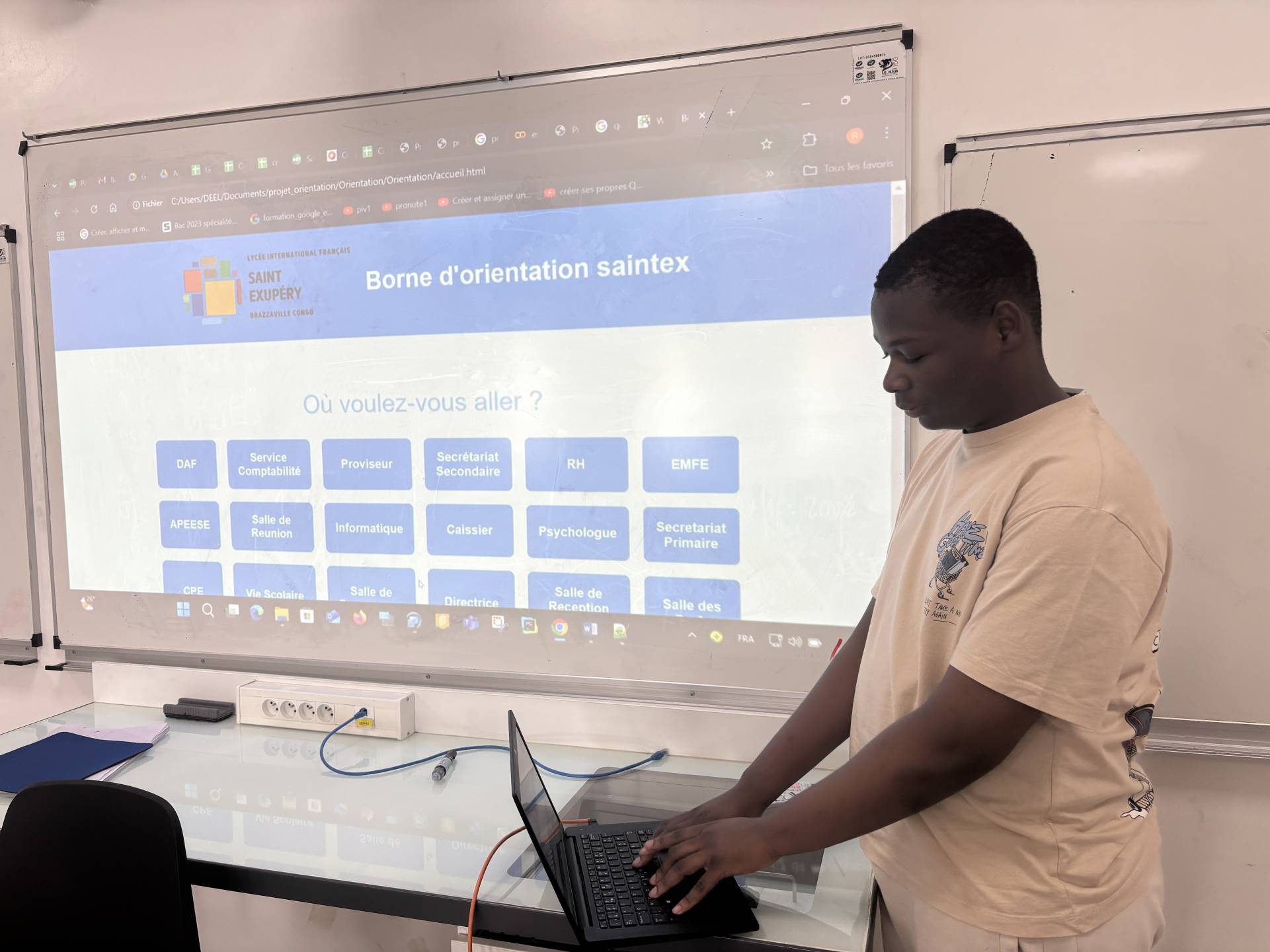 Le laboratoire de mathématiques du LIFSE est un espace innovant dédié à la formation et à la réflexion disciplinaire, didactique et pédagogique des équipes de mathématiques. Véritable lieu d’échanges, il favorise la collaboration entre notre établissement et les institutions congolaises, publiques comme privées, en proposant des pratiques et projets novateurs ainsi qu’une résolution collaborative de problèmes. En outre, le labo contribue activement au développement professionnel des enseignants, notamment dans le domaine de l’informatique, afin de renforcer l’efficacité de l’enseignement et consolider l’esprit d’équipe. Cette année, en plus du projet Chatbox et du rallye Mathabrazza, nos élèves de spécialité NSI, accompagnés de leur professeur, ont brillamment conçu et programmé une borne d’orientation pour les visiteurs du lycée, utilisant Python et du code HTML.